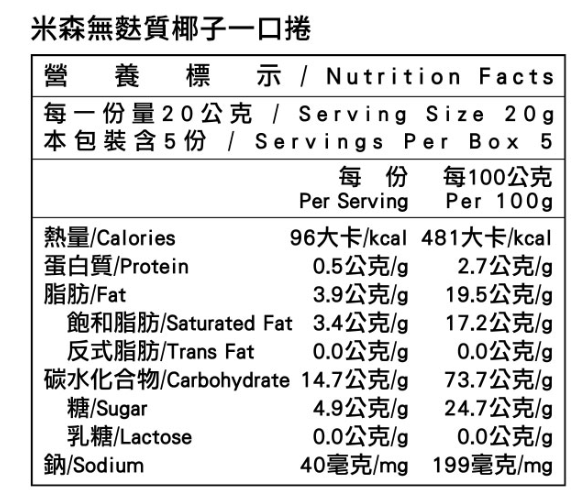 米森餅乾|無麩質椰子一口捲(20gx5包